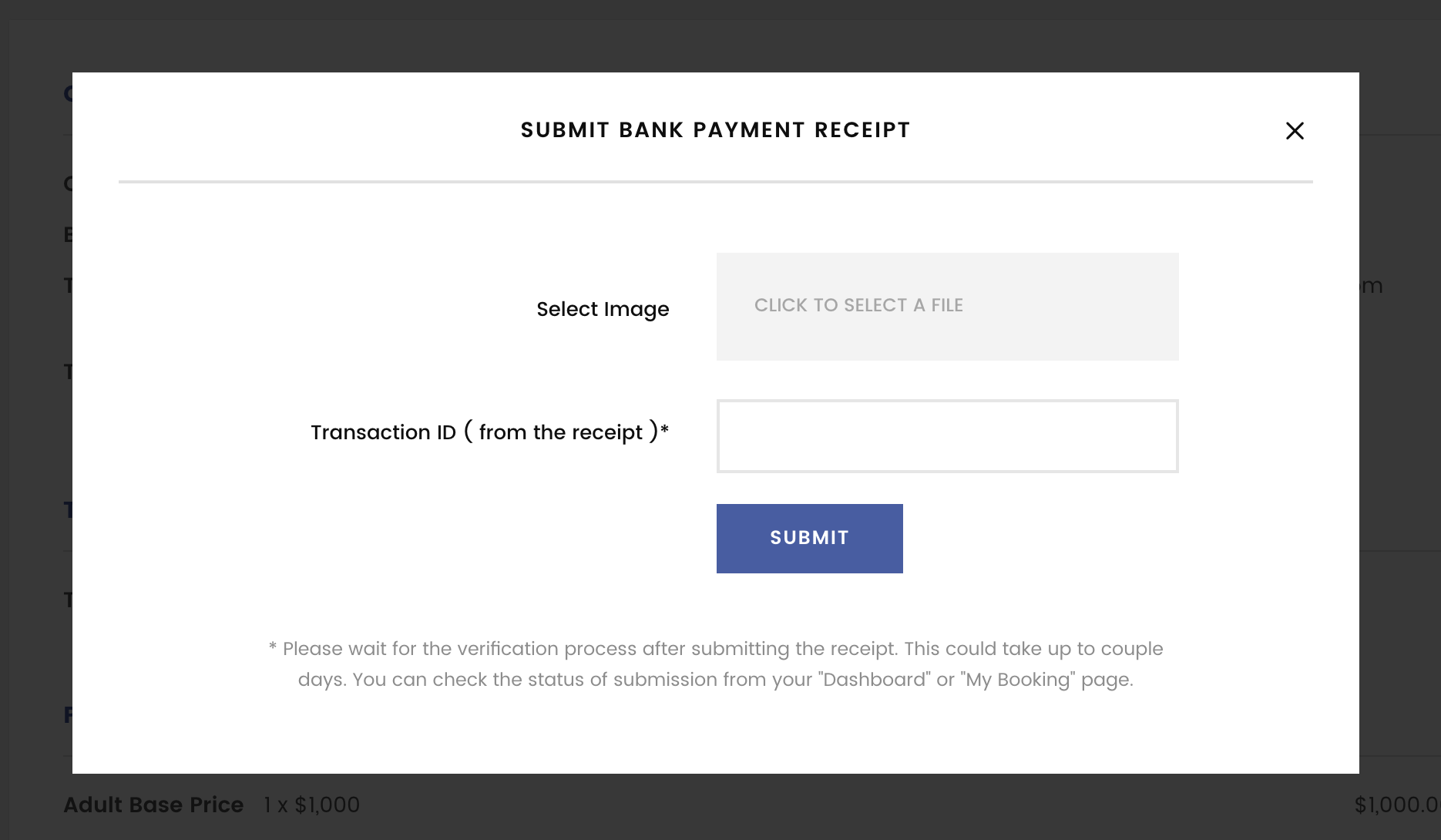 After clicking on the ‘Book and pay later’ button, customer will be able to see the transaction in the backend. There’re two buttons, Submit Payment Receipt and Make An Online Payment.